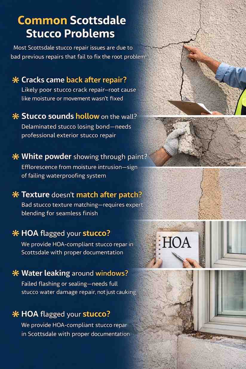 Most Scottsdale HOA communities require advance approval for exterior stucco repairs, and many specify the exact finish type, aggregate size, and colour palette permitted. We recommend requesting your HOA's architectural review guidelines before contacting any contractor. We routinely work with HOA management companies directly, handle the documentation and approval process, and complete repairs to the exact specification on file — so your repair passes inspection the first time without a second visit.